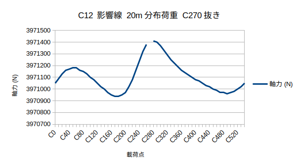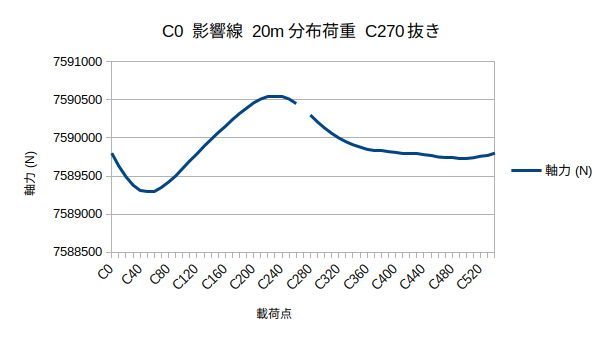影響線をC0のケーブルについて作成した 載荷点は今後のためC0〜C54まですべての点で行った。 C27で極端に値が低くなっており、その点を省いてグラフを作成したところきれいな曲線が出た 次回からはC1以降のケーブルについて影響線の作成を行う