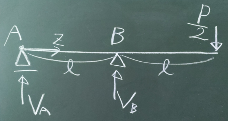 さて、$z$軸の原点は、ゲルバー梁の左端(点A)にあるから、上にのってる単純梁の