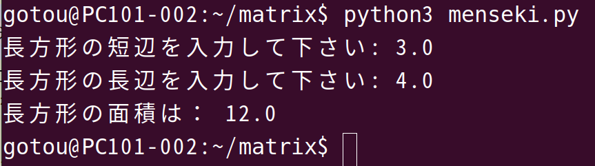 さて、短辺を長辺より長く入れたら計算しないで終わってしまうのでは 今ひとつ面白みがないので、 短辺を長辺より短く入れてくれるまでデータ入力を繰り返す プログラム(menseki3.py)を作ってみよう。