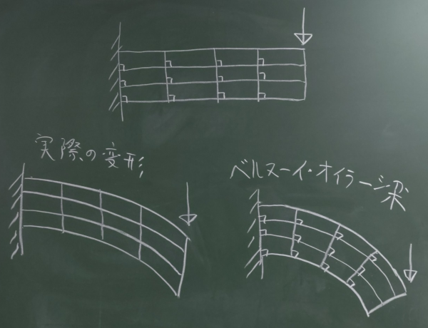 さて、ベルヌーイ・オイラーの仮定を設けると、 せん断ひずみ成分は0になってしまい、考えなければいけないひずみは、 梁の軸方向の垂直ひずみ $\varepsilon$だけとなるので、だいぶ話が簡単になる。 それにしても、梁(の断面の各点)は軸方向にしか伸び縮みしないのに、 それで梁がたわむ(曲がる)のを表現できるのだろうか。 それについては、次回以降、考えていく。