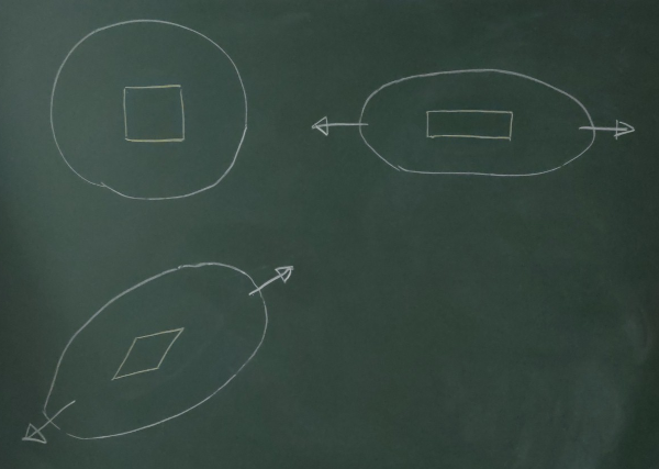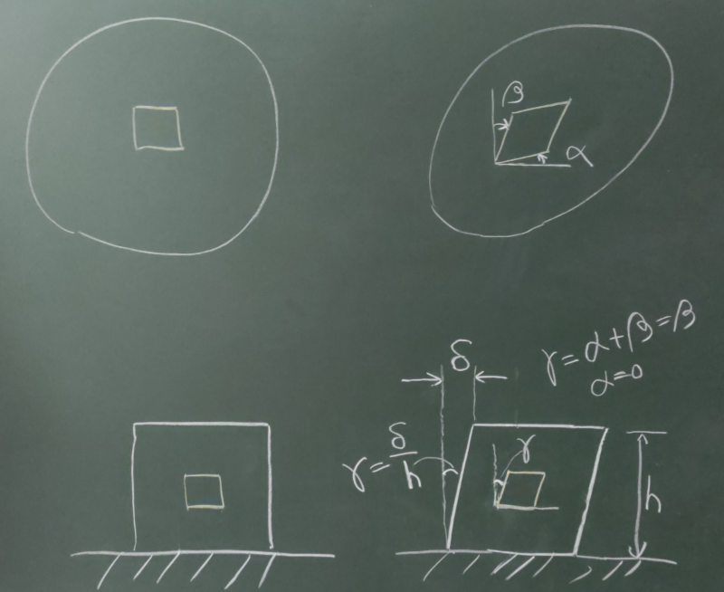 微小正方形要素は、頂点の直角がくずれて、ひし形に変形するだろう。