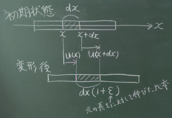 その結果、微小部分$dx$が初期状態よりちょっとだけ伸びたとする。