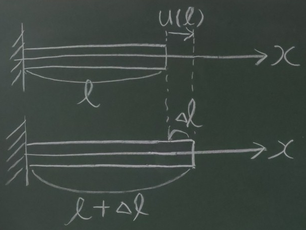 場合の垂直ひずみは、$\varepsilon(x)=\frac{\Delta\ell}{\ell}$で表される。
