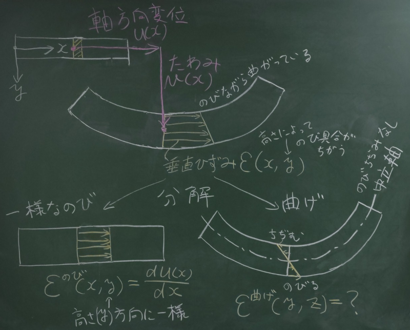$\varepsilon(x,y)=\varepsilon^{のび}(x,y)+\varepsilon^{曲げ}(x,y)$